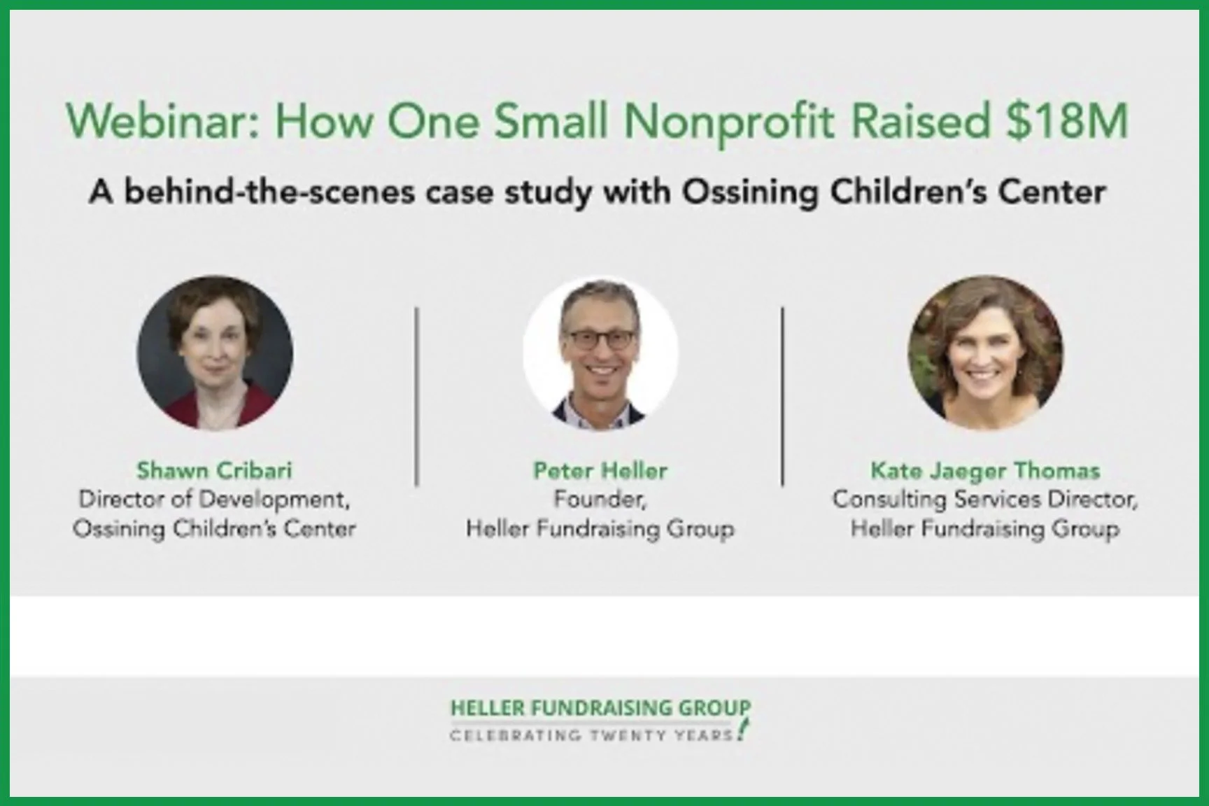 As our team grew to include new colleagues and consultants with diverse fundraising experience in a variety of nonprofit sectors, the Heller Group brought fresh ideas and perspectives to a growing list of clients.